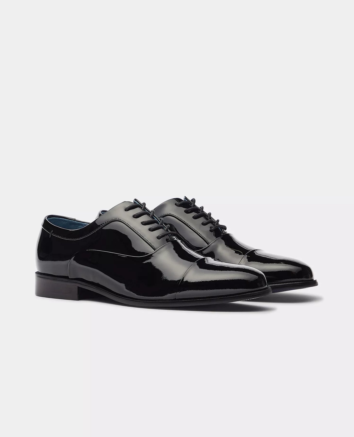 Prato patent leather Oxford shoe in black. Toe cap. Lace fastening with 5 eyelets. Synthetic welt and sole with stitching detail. Leather sock and lining.